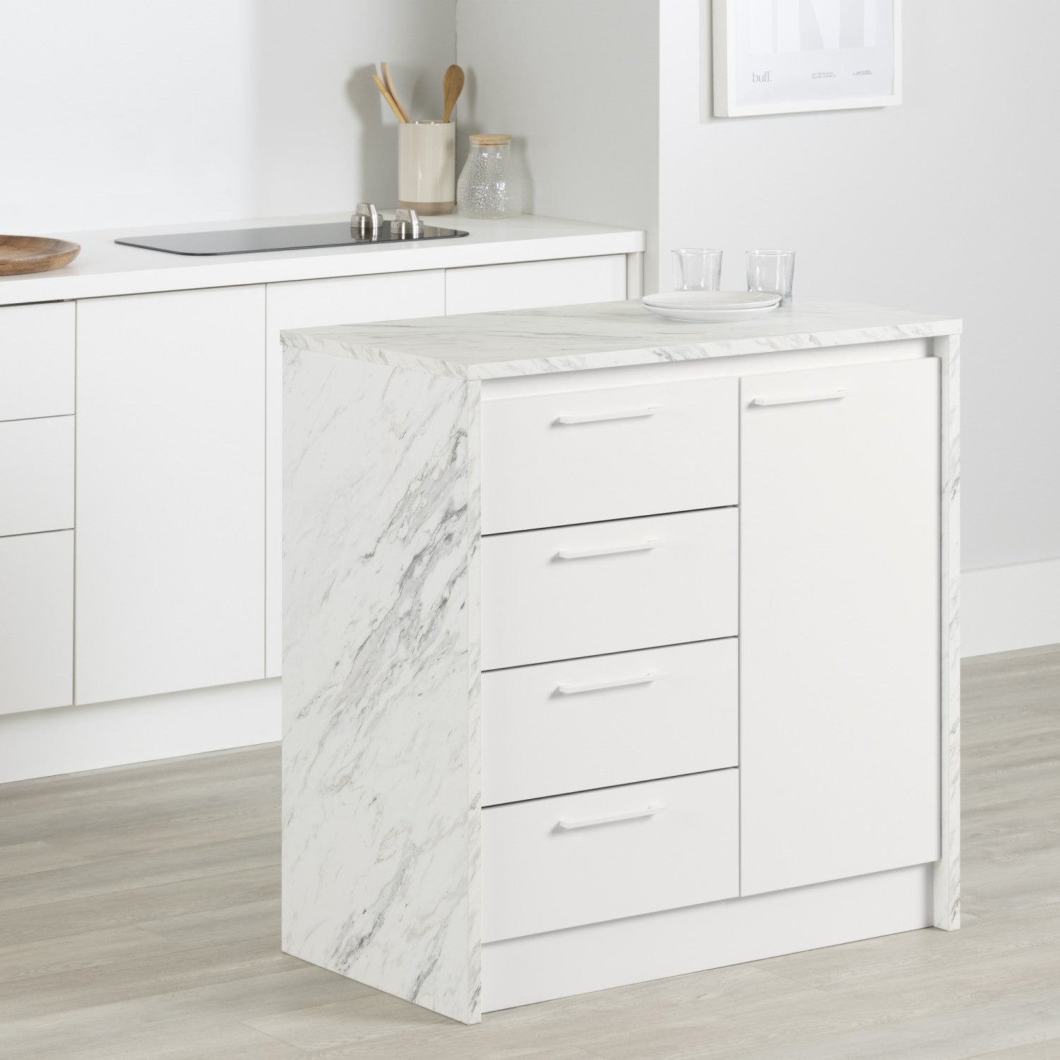 Whether you live in a condo, an apartment or a small house, this compact kitchen island with integrated storage will win you over. Featuring 4 drawers on metal runners, a door with removable shelf and a sturdy melamine surface, it's sure to get you in the mood to cook delicious food! Use the drawers to organize your utensils, dishcloths and other accessories. Behind the door, place your small appliances and adjust the shelf according to your needs. For even greater ease of use, the door features soft-closing hinges.