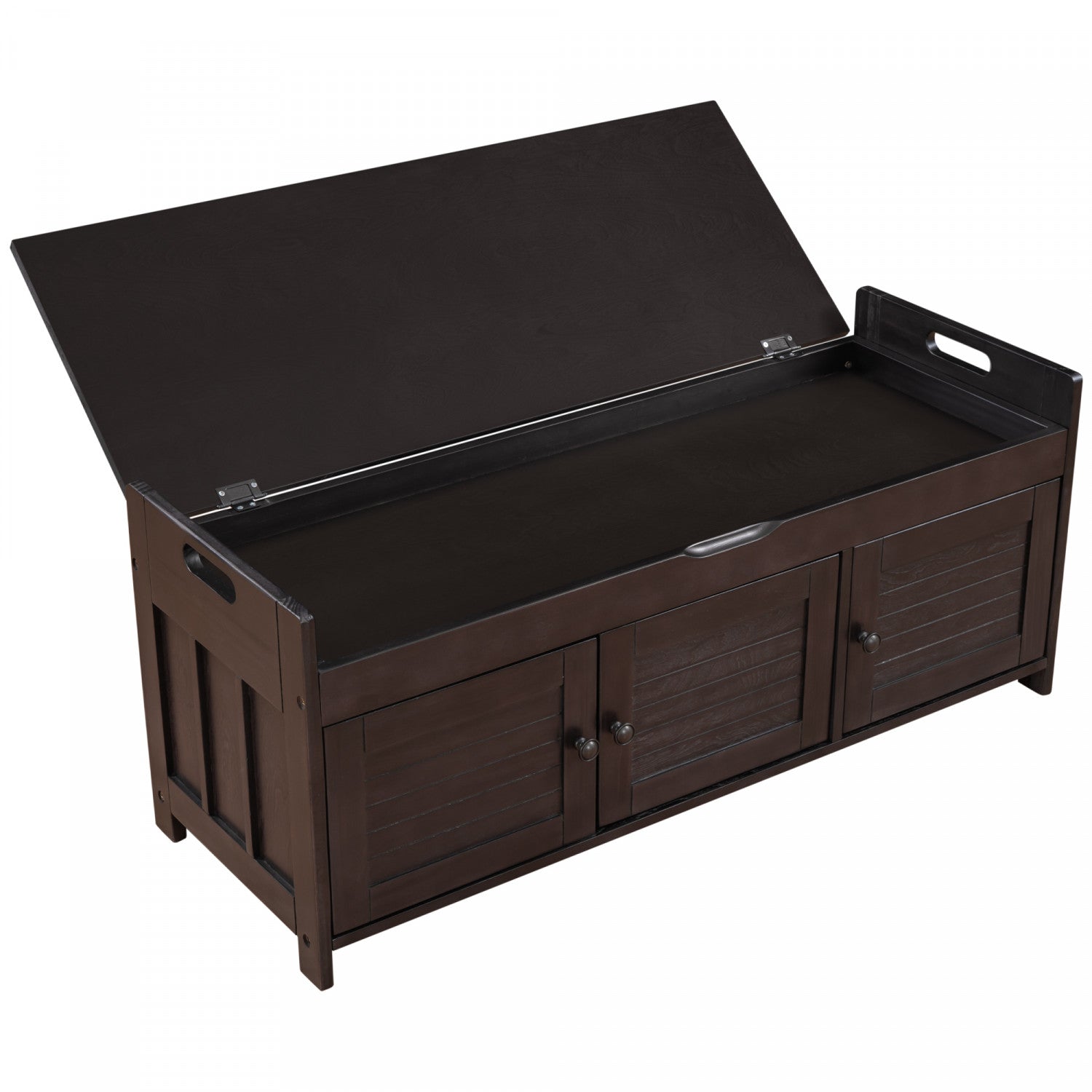 The storage bench blends rustic charm with modern functionality, offering seating, storage, and hidden space in one versatile piece. Featuring three shutter-style doors and elegant metal handles, this bench adds character to any entryway or bedroom. It offers two interior cabinets for organizing shoes and daily essentials, plus a lift-up top with hidden storage for private items. Made from mdf and pine wood, it’s sturdy enough to seat two adults comfortably. A removable cushion provides added comfort, and side handles make moving it easy.
