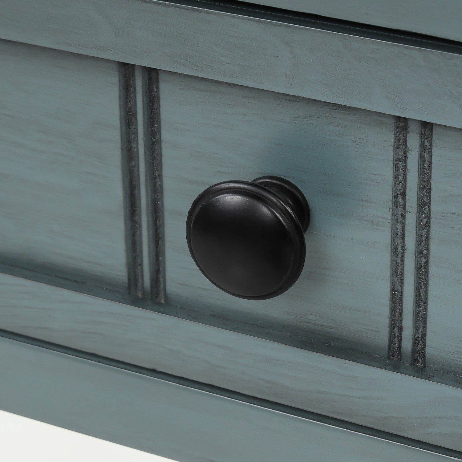 The console table is a stylish, space-saving accent designed for tight hallways or compact living areas. Crafted from solid wood and mdf, it features three drawers in two sizes for organizing everyday items. The open bottom shelf provides additional space for baskets or decor. With elegant tapered legs, round knobs, and a distressed finish, this piece adds charm and function to any interior. Assembly is quick and simple—just attach the legs and shelf. A timeless and practical addition to your home.
