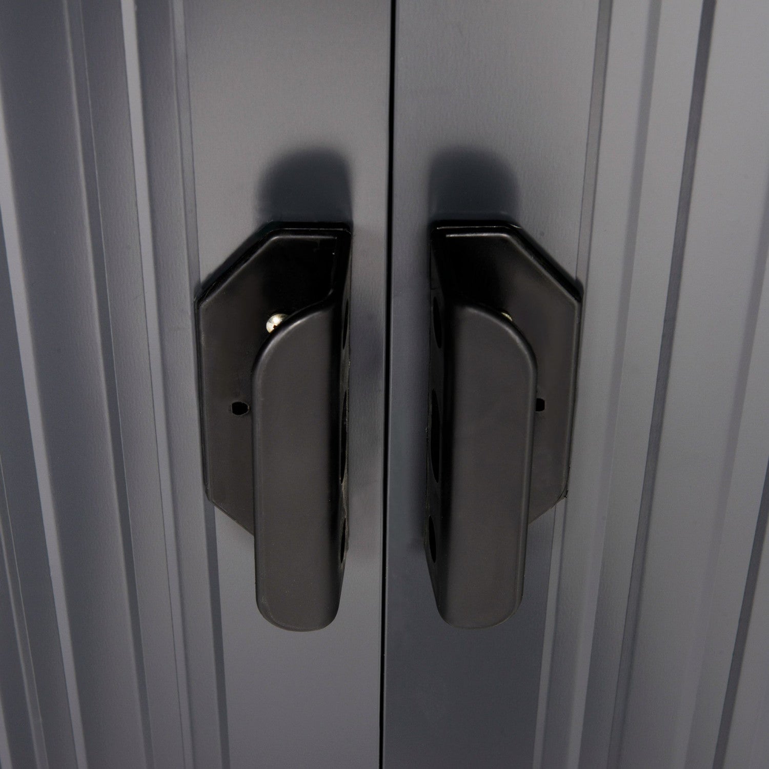 | Key Features | ● Ample storage space ● Steel panel walls and roof, resistant to rust and rain ● Sloped roof prevents water build-up ● Double sliding door for easy access in and out ● Lockable Door for security ● Two ventilation slots to keep the interior cool and airy ● Durable galvanized steel structure ● Assembly required |
