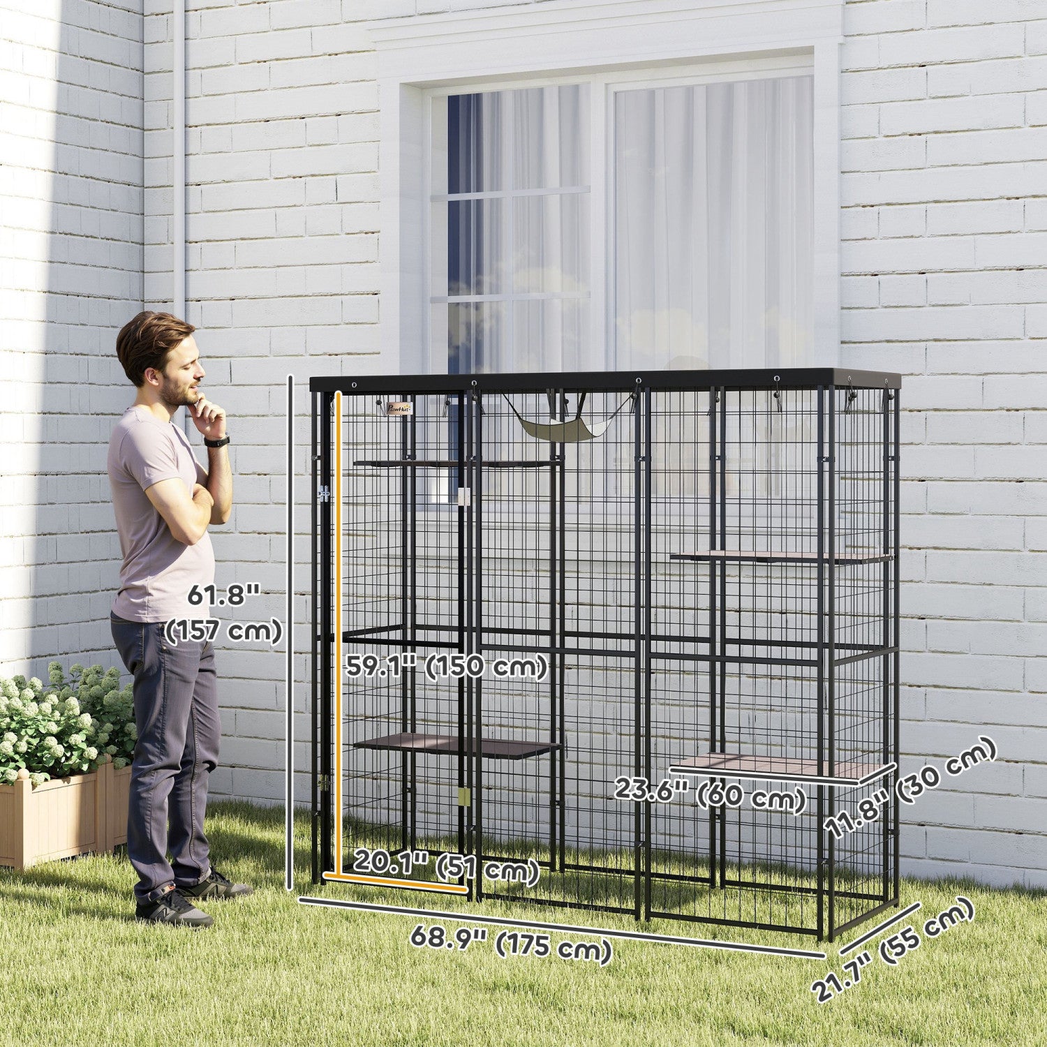 Key Features | ● Spacious 10 sq. ft (0.96㎡) living area comfortably fits 1-3 cats up to 11 lbs. (5 kg) ● Includes four casual installation perches and a hammock ● Waterproof and UV-resistant cover protects cats from elements ● Steel construction with access door ensures cat safety ● Easy to assemble with provided instructions for quick setup ● Removable and washable pads for cat's comfort ● Access door simplifies cat entry, exit, and cage maintenance ● Assembly required. |