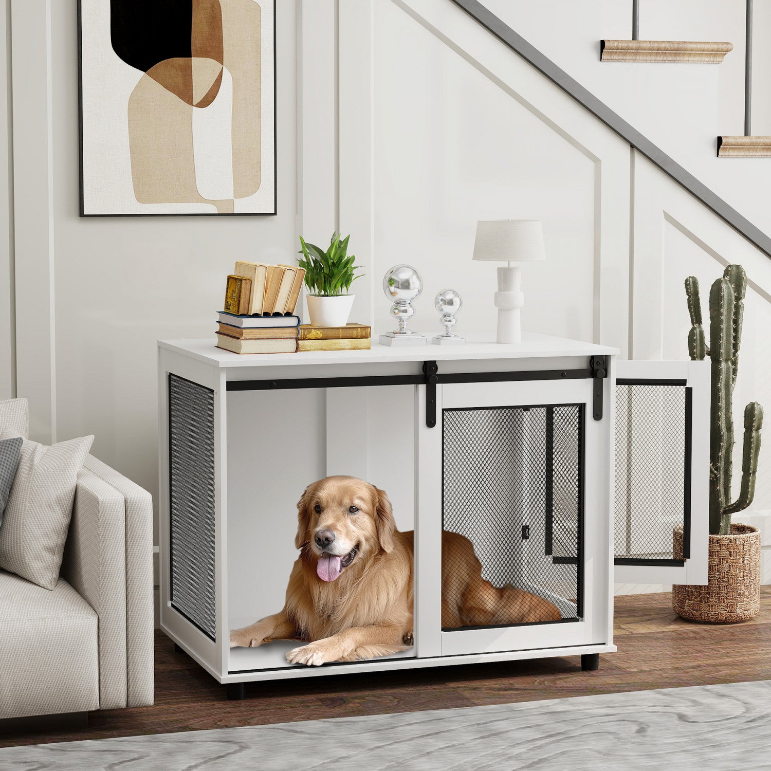 Pawhut Dog Crate Furniture, 39" Dog Kennel End Table With Sliding Barn Door, Furniture Style Dog Cage For Large Dogs, White