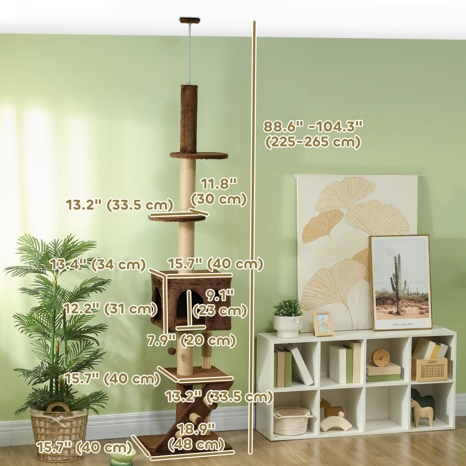 Pawhut Floor To Ceiling Cat Tree For Large Cats Adult, Cat Tower Adjustable Height 89"-104" W/ Scratching Post, Cat House, 3-steps, Hanging Ball, Perches, Anti-tip Kit, Brown