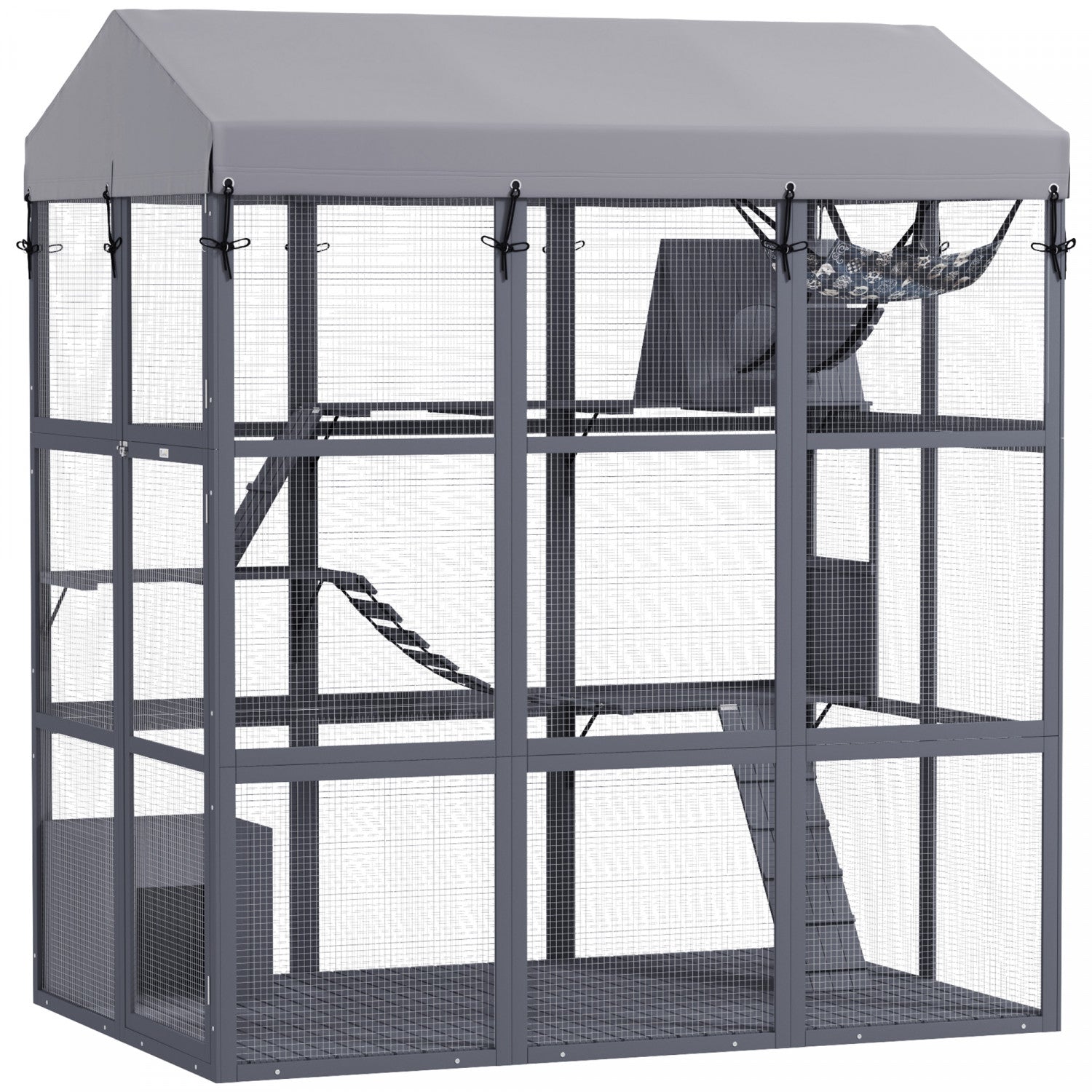| Key Features | ● Floor design prevents cats from digging and escaping ● Spacious with condos, platforms, ladders, ramps, and a hammock ● Accommodates 2-4 cats, fit for multiple cat households ● Assembly is straightforward, typically taking 1-1.5 hours for two people ● Constructed from fir wood with waterproof paint for durability ● UV-resistant top cover shields cats from harmful sun rays ● High door allows easy access and simplifies cleaning ● Sliding doors let cats easily enter, exit |
