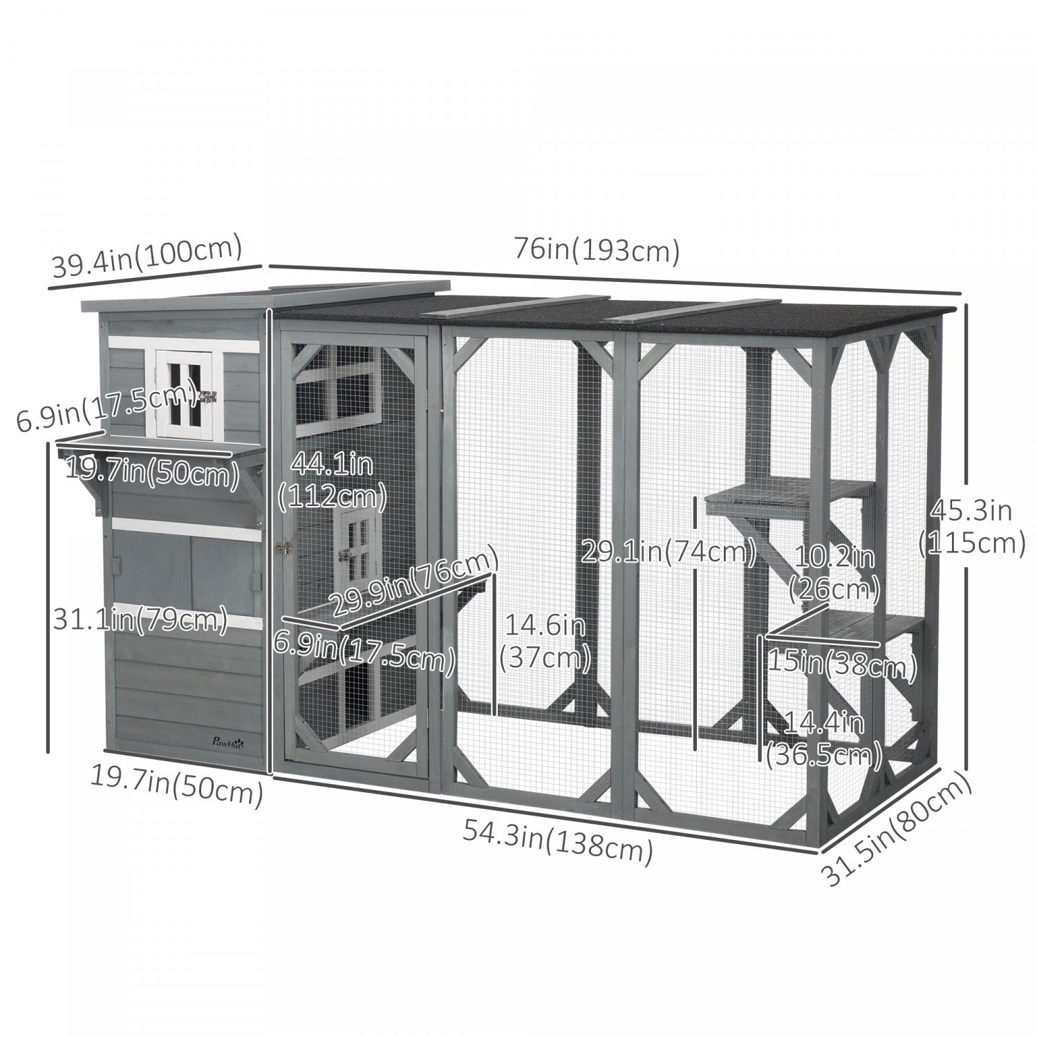 Pawhut Wooden Cat Catio, 76"l Walk In Outdoor Cat House With Asphalt Roof, Platforms, Lockable Doors, 3-tier Resting Condo, Observation Window, For 2-3 Cats, Light Grey