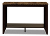 Make a bold statement in your living room with this Roma sofa table. This piece's marble-look tabletop draws the eye with its muted shades of cream, onyx and grey. The durable and beautiful surface is the perfect place for drinks and decorative accents. A sophisticated cappuccino finish wraps the base of the sofa table, which features a lower shelf for additional space. Stylish, tapered legs provide the finishing touch and offer a sturdy foundation for lamps, potted plants and decor.