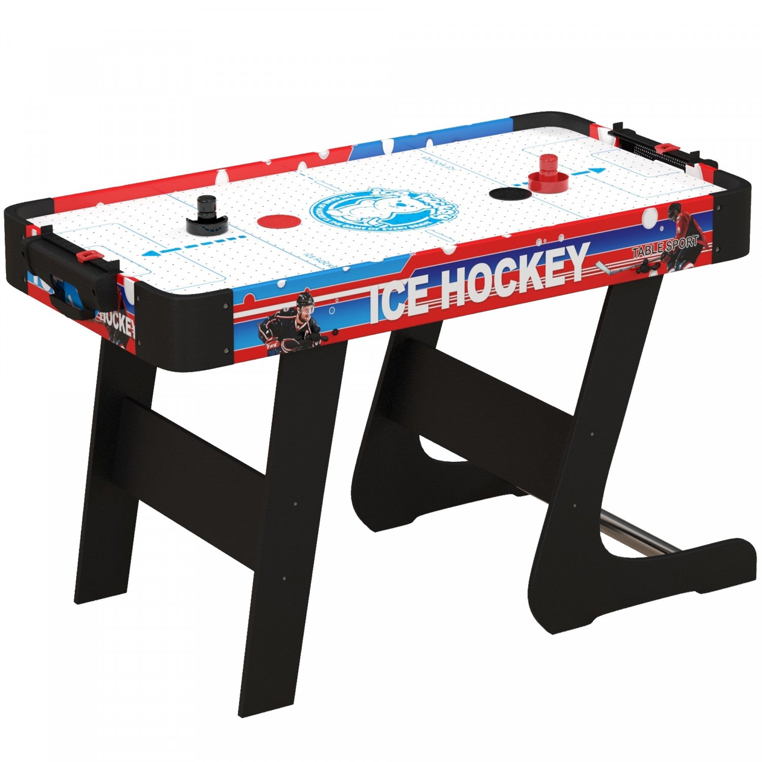 | Key Features | - Designed to save space and provide easy storage and setup process; - Freestanding design when folded; - Complete with 2 air hockey pucks and 2 pushers; - Constructed of P2 grade MDF and stainless steel; - Rounded table corners protect you from accidental bump; - Suitable for kids over 12 yrs.; - Assembly required; |
