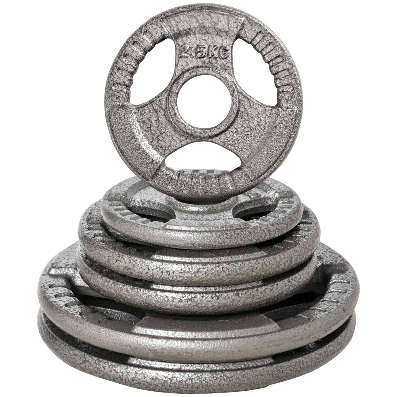 | Key Features | - Suitable for both beginners and advanced fitness levels to use in your home, gym, garage, or workout space; - The weight plates made of solid steel with enamel finish; - Each weight plate labeled in KG for easy recognition; - Build with 3 large hole grip design for easy and safe grip; - Can be use as strength training exercises with or without a barbell; - Total 77lbs weight, include two 22lbs, two 11lbs, and two 6lbs weight plates; - A Փ2.25" center hole fits any dumbbell bars with diameter Փ2" or less; |