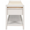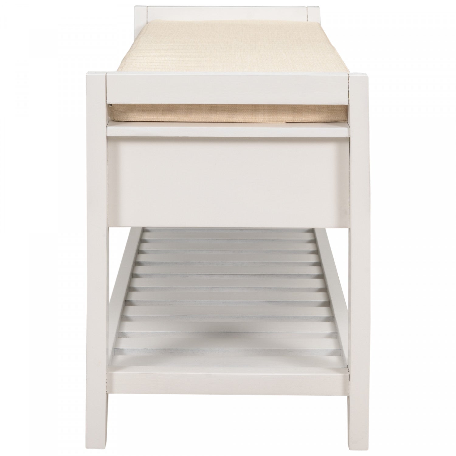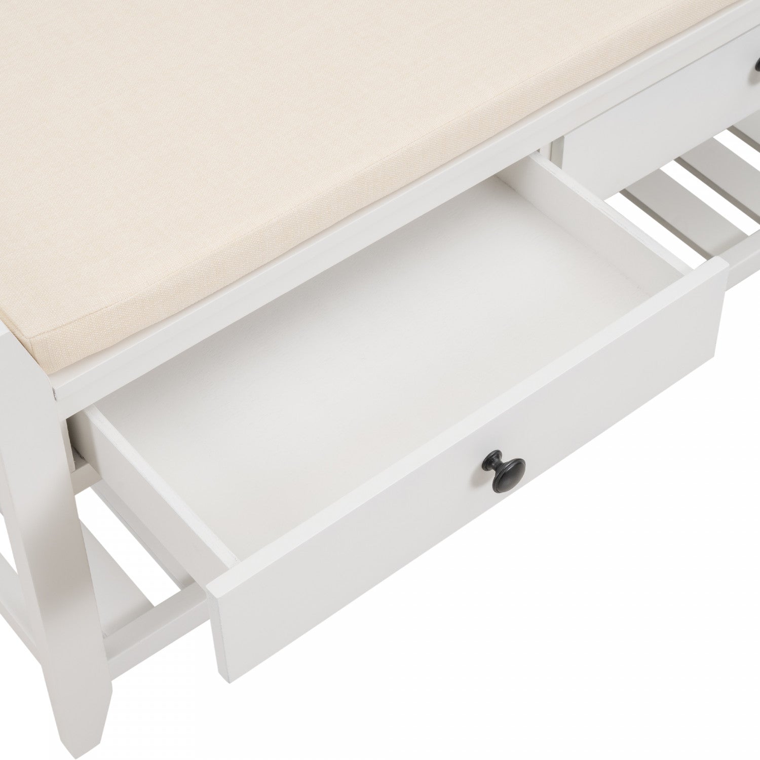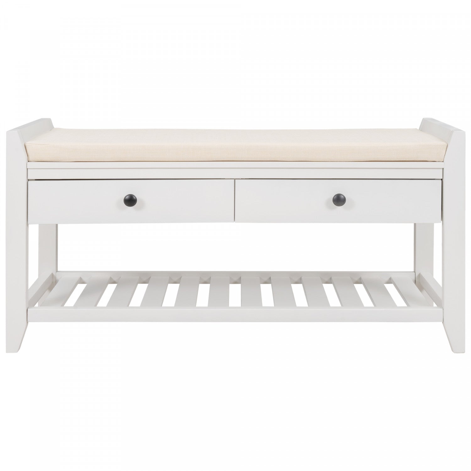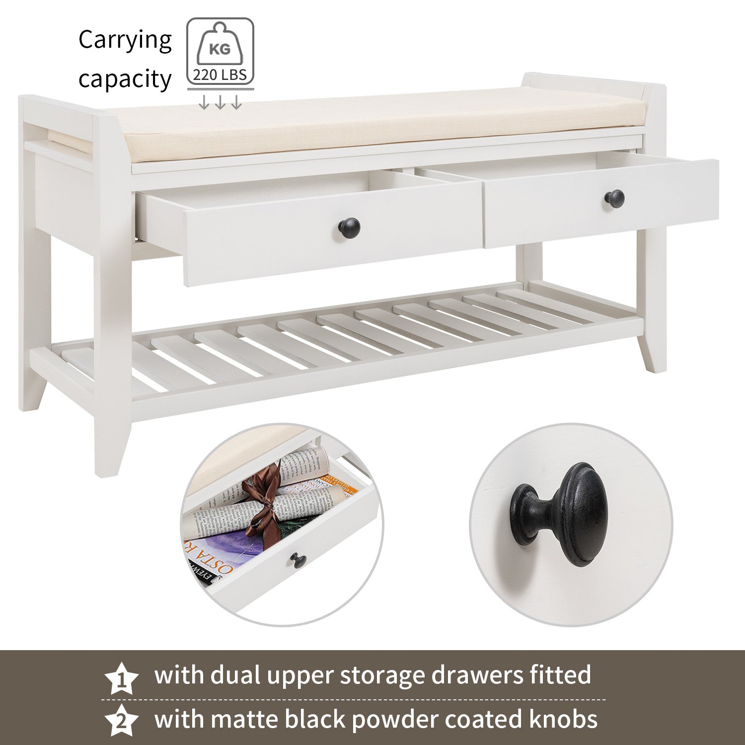 The shoe rack bench offers a stylish storage solution for busy entryways. Featuring a soft cushioned seat, two sliding drawers, and a bottom shelf for shoes or baskets, it keeps essentials organized and accessible. Crafted with pine wood and mdf, this multipurpose bench supports up to 220 lbs and includes matte black knobs for a refined touch. Ideal for small spaces and daily use. Simple assembly with a screwdriver required.