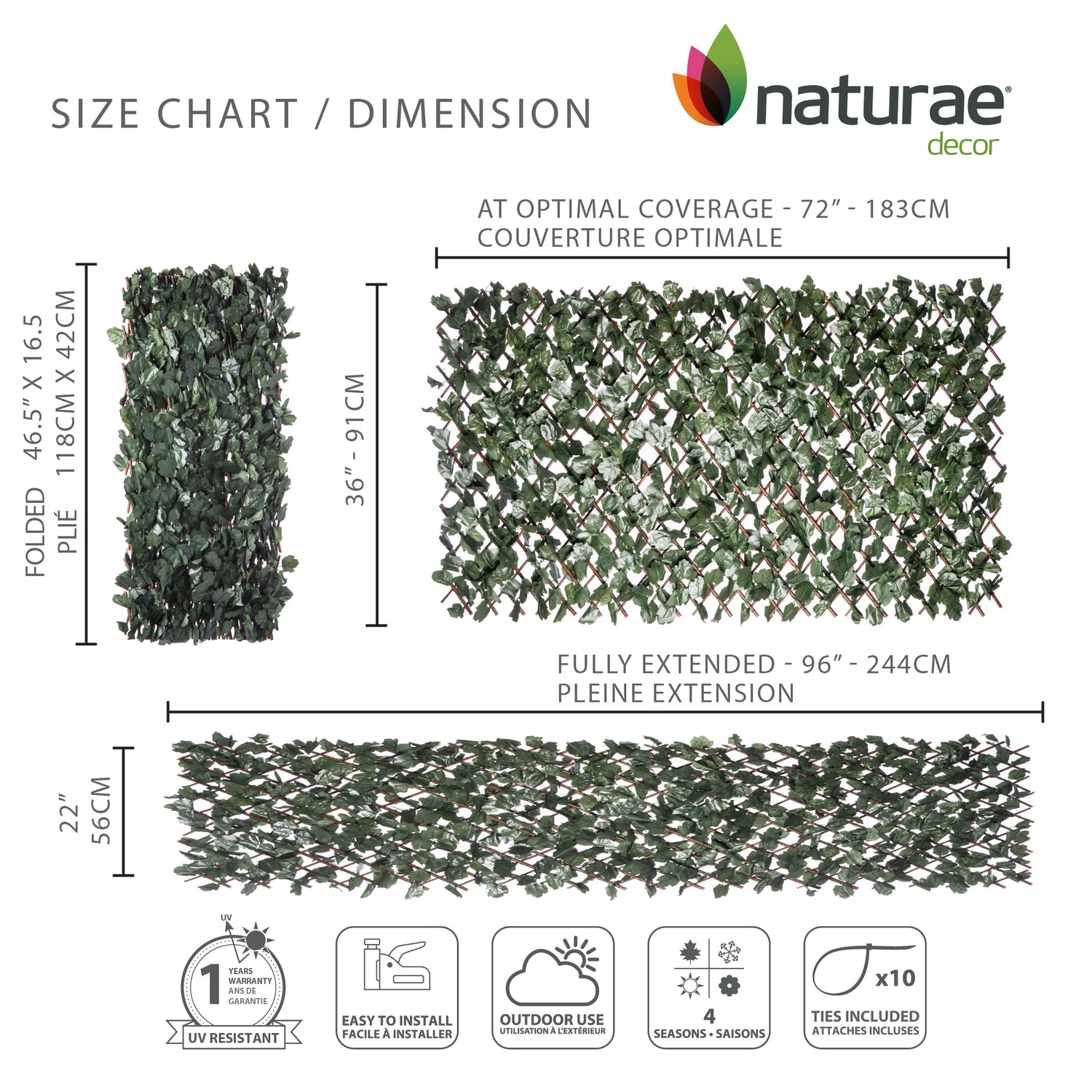 The Naturae Decor expandable trellis will be the perfect addition to add style and lifelike vegetation to your outdoor space. Made from high-quality materials and offering optimal privacy with UV-protected leaves, you can enjoy the product for years without having to replace it. A versatile solution to redesign and brighten up any space, whether it’s a patio, a deck, or a balcony. The realistic luxurious artificial foliage requires no maintenance. Easy to install and made of sturdy but lightweight materials for outdoor use. Simply secure to a support and extend the trellis to the desired width and height. Standard size – optimal extension 36 in x 72 in, and maximum extension 18 in x 90 in (16 in x 48 in when folded). The expandable trellis is a cost-effective way to bring privacy and beauty to your project regardless of its size.