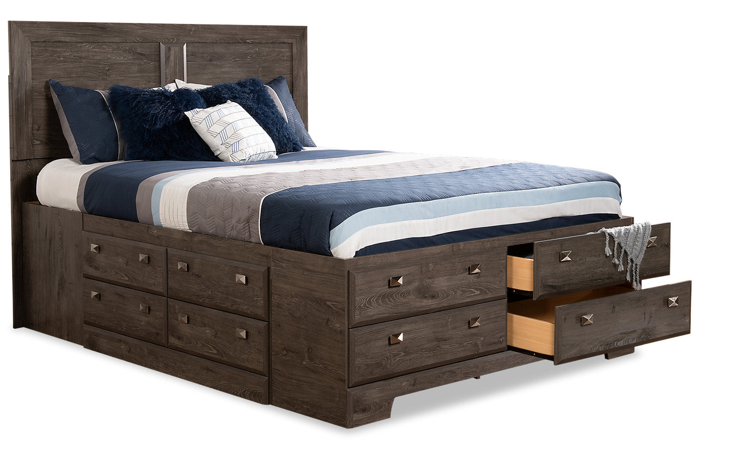 Embrace the feeling of contemporary style with the Yorkdale grey full storage bed. A soft grey finish made from engineered alabaster oak wood creates a neutral base to pair perfectly with almost any room decor. A sleek, tall headboard features a simple two-panel design that lets the alabaster oak finish colour shine through. Built into the lower half of the bed are a dozen drawers to help you keep extra blankets or pyjamas close at hand. Let the sleek, modern design of the Yorkdale grey bed help you build the perfect space for rest and relaxation.