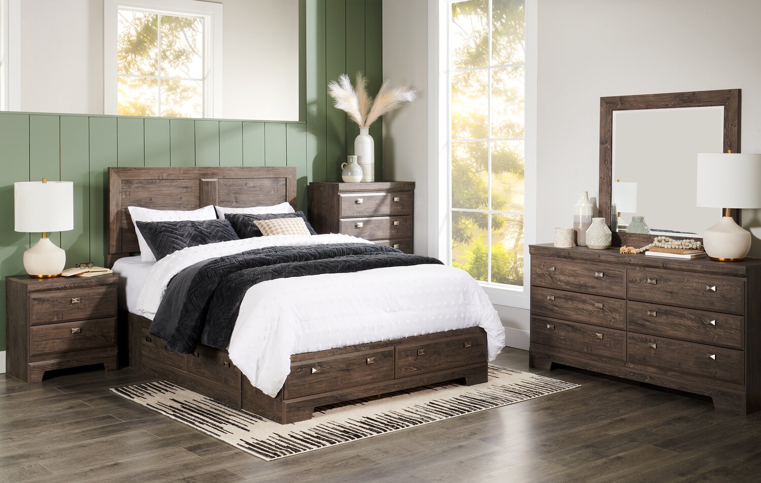 Yorkdale 5pc Bedroom Set with 6-Drawer Storage Bed, Dresser & Mirror, Grey - Queen Size